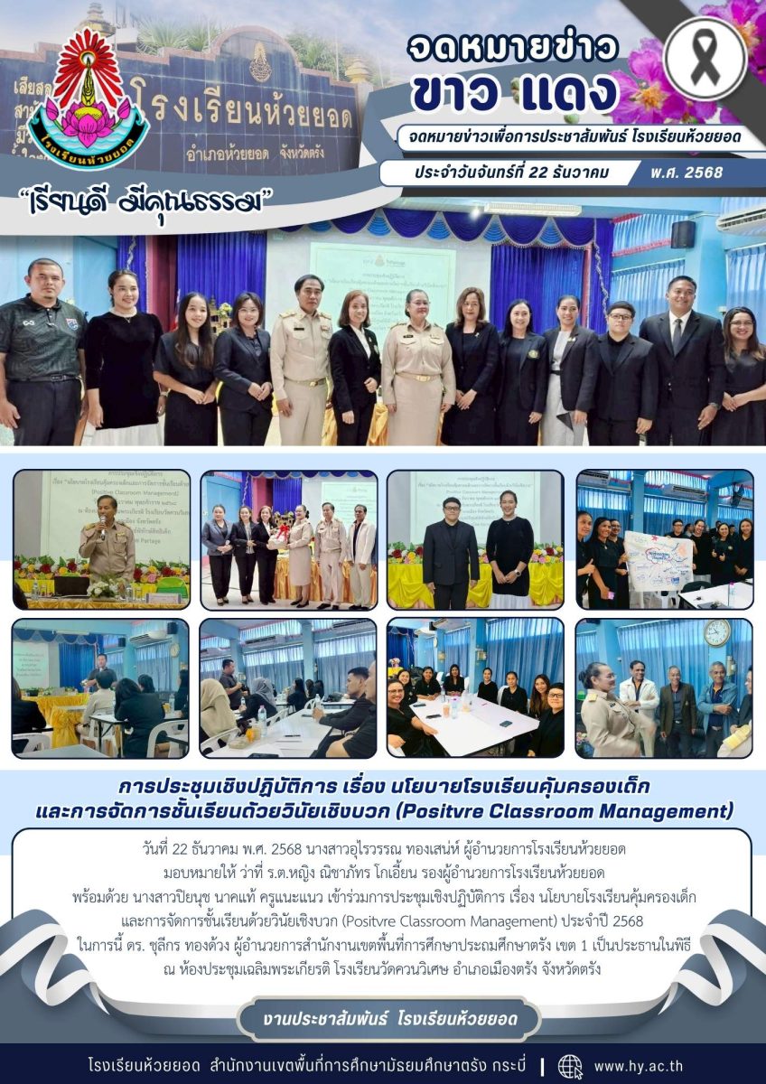 วันที่ 22 ธันวาคม พ.ศ. 2568 นางสาวอุไรวรรณ ทองเสน่ห์ ผู้อำนวยการโรงเรียนห้วยยอด มอบหมายให้ ว่าที่ ร.ต.หญิง ณิชาภัทร โกเอี้ยน รองผู้อำนวยการโรงเรียนห้วยยอด พร้อมด้วย นางสาวปิยนุช นาคแท้ ครูแนะแนว เข้าร่วมการประชุมเชิงปฏิบัติการ เรื่อง นโยบายโรงเรียนคุ้มครองเด็ก และการจัดการชั้นเรียนด้วยวินัยเชิงบวก (Positvre Classroom Management) ประจำปี 2568 ในการนี้ ดร. ชุลีกร ทองด้วง ผู้อำนวยการสำนักงานเขตพื้นที่การศึกษาประถมศึกษาตรัง เขต 1 เป็นประธานในพิธี ณ ห้องประชุมเฉลิมพระเกียรติ โรงเรียนวัดควนวิเศษ อำเภอเมืองตรัง จังหวัดตรัง