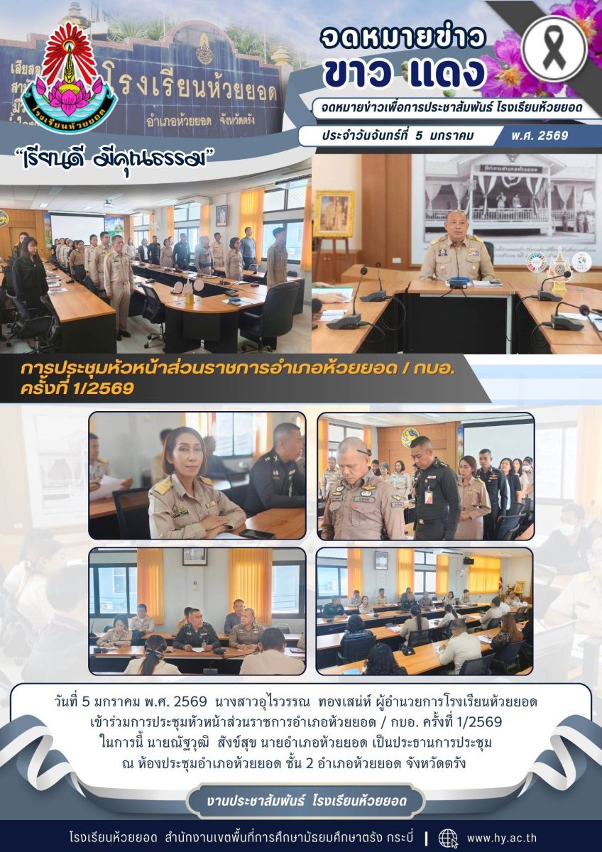 วันที่ 5 มกราคม พ.ศ. 2569 นางสาวอุไรวรรณทองเสน่ห์ ผู้อำนวยการโรงเรียนห้วยยอดเข้าร่วมการประชุมหัวหน้าส่วนราชการอำเภอห้วยยอด / กบอ. ครั้งที่ 1/2569 ในการนี้ นายณัฐวุฒิ สังข์สุข นายอำเภอห้วยยอด เป็นประธานการประชุมณ ห้องประชุมอำเภอห้วยยอด ชั้น 2 อำเภอห้วยยอด จังหวัดตรัง