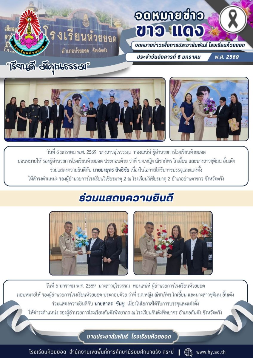 วันที่ 6 มกราคม พ.ศ. 2569 นางสาวอุไรวรรณ ทองเสน่ห์ ผู้อำนวยการโรงเรียนห้วยยอดมอบหมายให้ รองผู้อำนวยการโรงเรียนห้วยยอด ประกอบด้วย ว่าที่ ร.ต.หญิง ณิชาภัทร โกเอี้ยน และนางสาวชุติมน อั้นเต้ง ร่วมแสดงความยินดีกับ นายสาคร ขันชู เนื่องในโอกาสได้รับการบรรจุและแต่งตั้งให้ดำรงตำแหน่ง รองผู้อำนวยการโรงเรียนกันตังพิทยากร ณ โรงเรียนกันตังพิทยากร อำเภอกันตัง จังหวัดตรัง