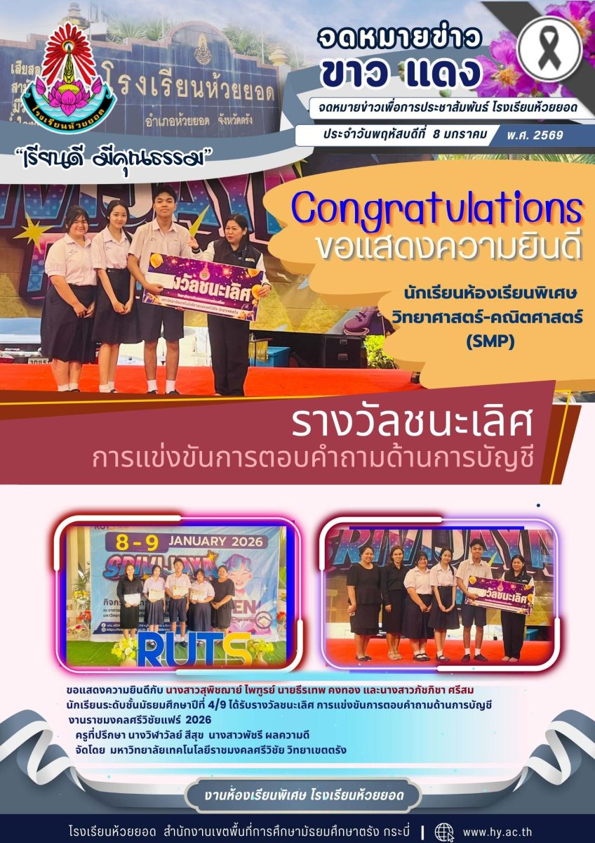 ขอแสดงความยินดีกับนักเรียนห้องเรียนพิเศษวิทยาศาสตร์-คณิตศาสตร์ (SMP) นางสาวสุพิชฌาย์ ไพฑูรย์ นายธีรเทพ คงทอง และนางสาวภัชภิชา ศรีสม นักเรียนระดับชั้นมัธยมศึกษาปีที่ 4/9 ได้รับรางวัลชนะเลิศ การแข่งขันการตอบคำถามด้านการบัญชี งานราชมงคลศรีวิชัยแฟร์ 2026 ครูที่ปรึกษา นางวิฬาวัลย์ สีสุข นางสาวพัชรี ผลความดี จัดโดย มหาวิทยาลัยเทคโนโลยีราชมงคลศรีวิชัย วิทยาเขตตรัง