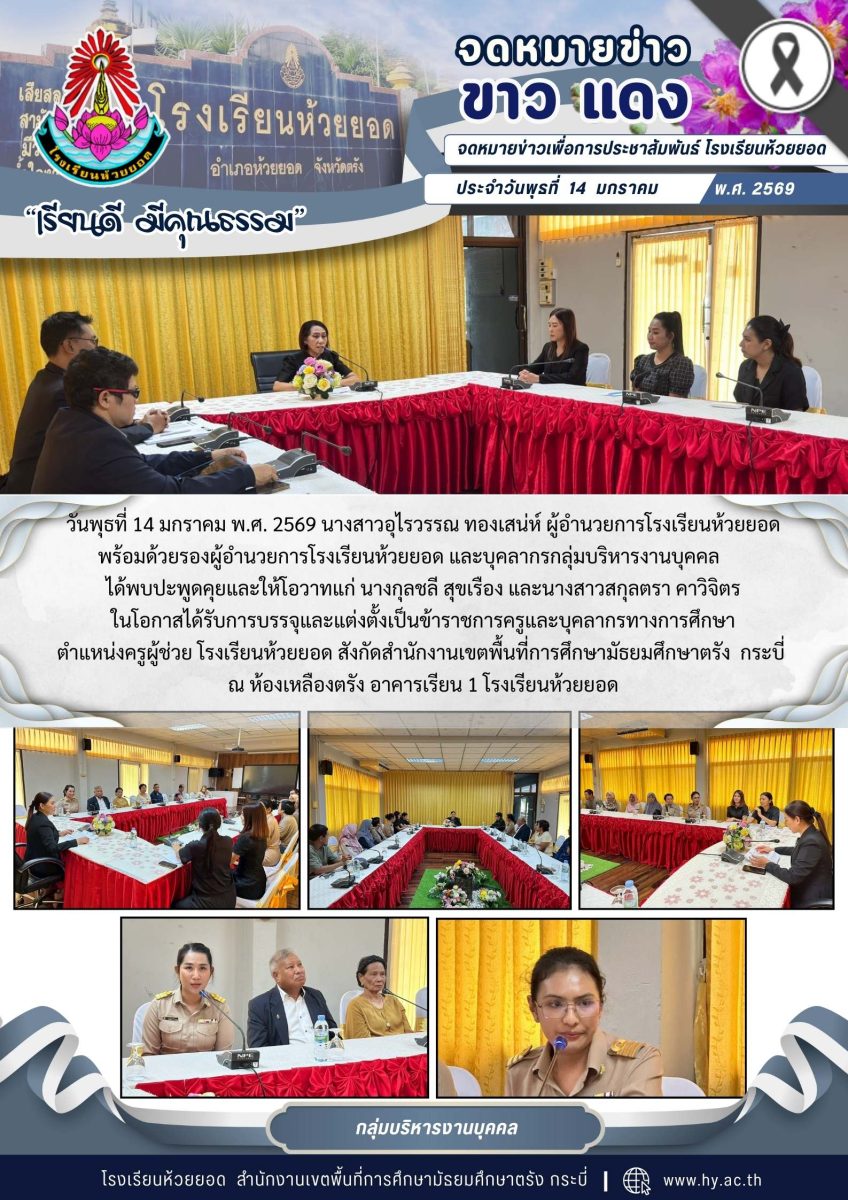 วันพุธที่ 14 มกราคม พ.ศ. 2569 นางสาวอุไรวรรณ ทองเสน่ห์ ผู้อำนวยการโรงเรียนห้วยยอด พร้อมด้วยรองผู้อำนวยการโรงเรียนห้วยยอด และบุคลากรกลุ่มบริหารงานบุคคลได้พบปะพูดคุยและให้โอวาทแก่ นางกุลชลี สุขเรือง และนางสาวสกุลตรา คาวิจิตร ในโอกาสได้รับการบรรจุและแต่งตั้งเป็นข้าราชการครูและบุคลากรทางการศึกษา ตำแหน่งครูผู้ช่วย โรงเรียนห้วยยอด สังกัดสำนักงานเขตพื้นที่การศึกษามัธยมศึกษาตรัง กระบี่ ณ ห้องเหลืองตรัง อาคารเรียน 1 โรงเรียนห้วยยอด