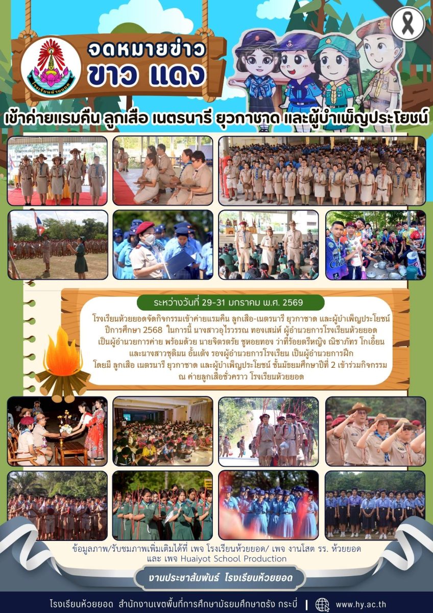 วันที่ 29-31 มกราคม พ.ศ. 2569 โรงเรียนห้วยยอดจัดกิจกรรมเข้าค่ายแรมคืน ลูกเสือ-เนตรนารี ยุวกาชาด และผู้บำเพ็ญประโยชน์ ปีการศึกษา 2568 ในการนี้ นางสาวอุไรวรรณ ทองเสน่ห์ ผู้อำนวยการโรงเรียนห้วยยอดเป็นผู้อำนวยการค่าย พร้อมด้วย นายจิตรตรัย ชูหอยทอง ว่าที่ร้อยตรีหญิง ณิชาภัทร โกเอี้ยน และนางสาวชุติมน อั้นเต้ง รองผู้อำนวยการโรงเรียน เป็นผู้อำนวยการฝึก โดยมี ลูกเสือ เนตรนารี ยุวกาชาด และผู้บำเพ็ญประโยชน์ ชั้นมัธยมศึกษาปีที่ 2 เข้าร่วมกิจกรรมณ ค่ายลูกเสือชั่วคราว โรงเรียนห้วยยอด