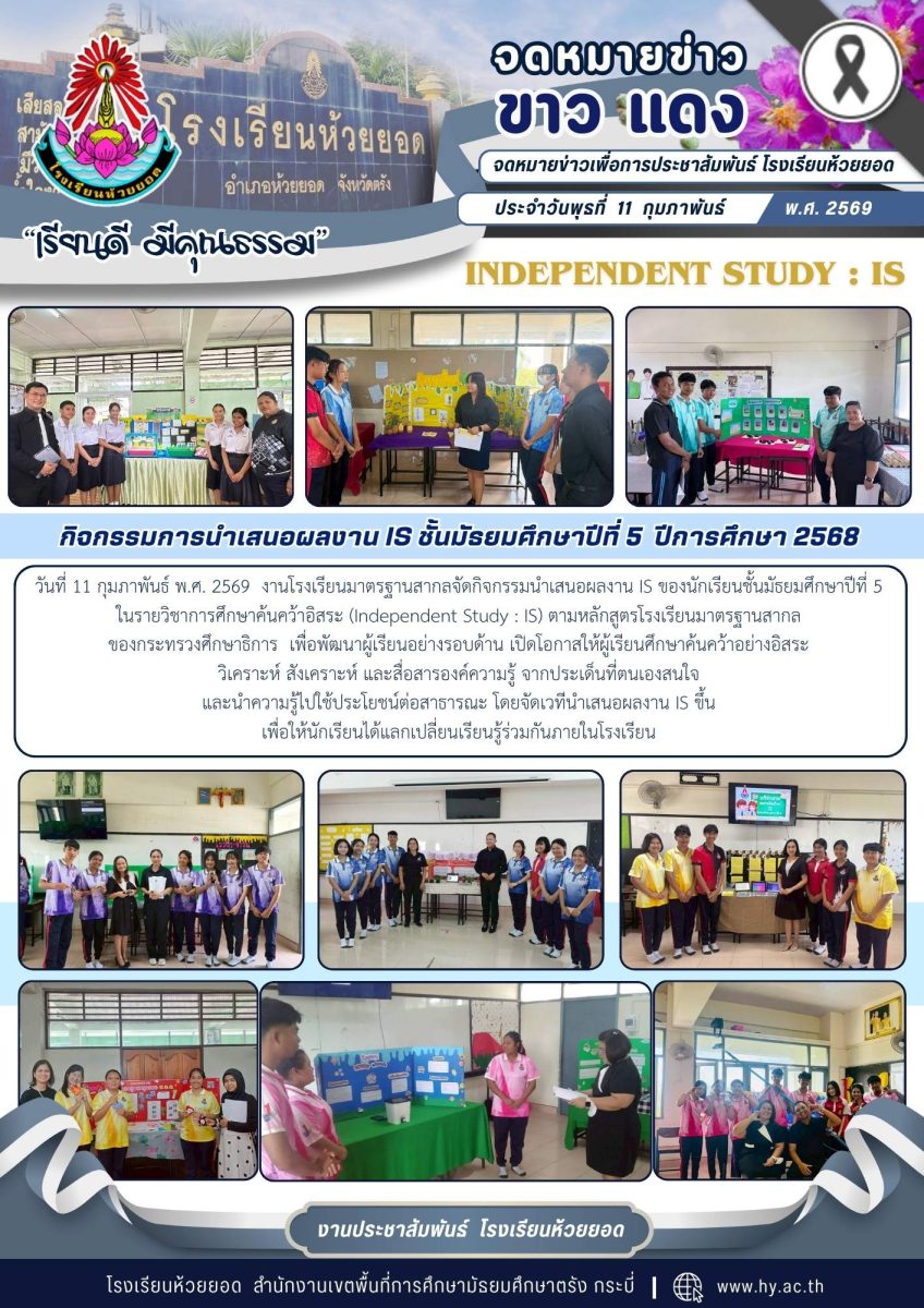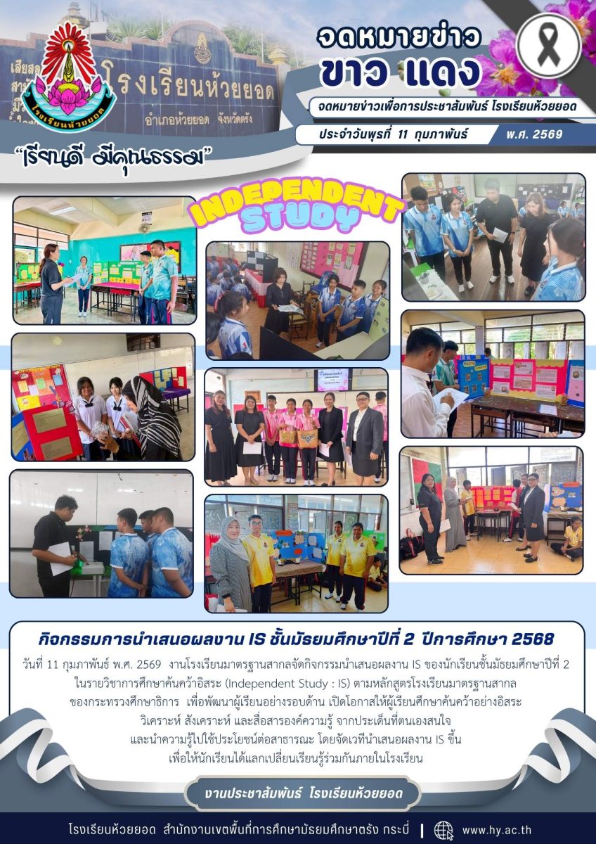 วันที่ 11 กุมภาพันธ์ พ.ศ. 2569 งานโรงเรียนมาตรฐานสากลจัดกิจกรรมนำเสนอผลงาน IS ของนักเรียนชั้นมัธยมศึกษาปีที่ 2 ในรายวิชาการศึกษาค้นคว้าอิสระ (Independent Study : IS) ตามหลักสูตรโรงเรียนมาตรฐานสากลของกระทรวงศึกษาธิการ เพื่อพัฒนาผู้เรียนอย่างรอบด้าน เปิดโอกาสให้ผู้เรียนศึกษาค้นคว้าอย่างอิสระ วิเคราะห์ สังเคราะห์ และสื่อสารองค์ความรู้ จากประเด็นที่ตนเองสนใจและนำความรู้ไปใช้ประโยชน์ต่อสาธารณะ โดยจัดเวทีนำเสนอผลงาน IS ขึ้นเพื่อให้นักเรียนได้แลกเปลี่ยนเรียนรู้ร่วมกันภายในโรงเรียน