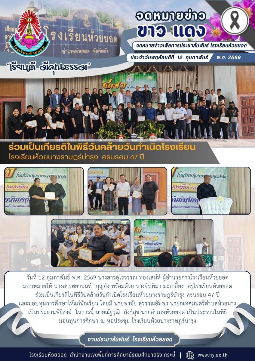 วันที่ 12 กุมภาพันธ์ พ.ศ. 2569 นางสาวอุไรวรรณ ทองเสน่ห์ ผู้อำนวยการโรงเรียนห้วยยอด มอบหมายให้ นางสาวศยานนท์ บุญยัง พร้อมด้วย นางจันทิมา มะเกลี้ยง ครูโรงเรียนห้วยยอดร่วมเป็นเกียรติในพิธีวันคล้ายวันกำเนิดโรงเรียนห้วยนางราษฎร์บำรุง ครบรอบ 47 ปี และมอบทุนการศึกษาให้แก่นักเรียน โดยมี นายพรชัย สุวรรณอัมพร นายกเทศมนตรีตำบลห้วยนาง เป็นประธานพิธีสงฆ์ ในการนี้ นายณัฐวุฒิ สังข์สุข นายอำเภอห้วยยอด เป็นประธานในพิธี มอบทุนการศึกษา ณ หอประชุม โรงเรียนห้วยนางราษฎร์บำรุง