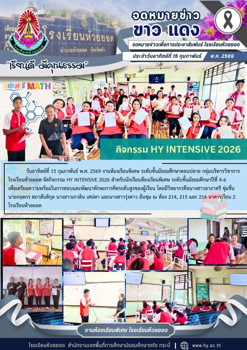 วันอาทิตย์ที่ 15 กุมภาพันธ์ พ.ศ. 2569 งานห้องเรียนพิเศษ ระดับชั้นมัธยมศึกษาตอนปลาย กลุ่มบริหารวิชาการ โรงเรียนห้วยยอด จัดกิจกรรม HY INTENSIVE 2026 สำหรับนักเรียนห้องเรียนพิเศษ ระดับชั้นมัธยมศึกษาปีที่ 4-6 เพื่อเตรียมความพร้อมในการสอบและพัฒนาทักษะการคิดระดับสูงของผู้เรียน โดยมีวิทยากรคือนางสาวอาภาศรี ชุ่มชื่น นายกฤตกร สภาสันติกุล นางสาวเกวลิน เสน่หา และนางสาวรุ่งดาว อ้นชุม ณ ห้อง 214, 215 และ 216 อาคารเรียน 2 โรงเรียนห้วยยอด