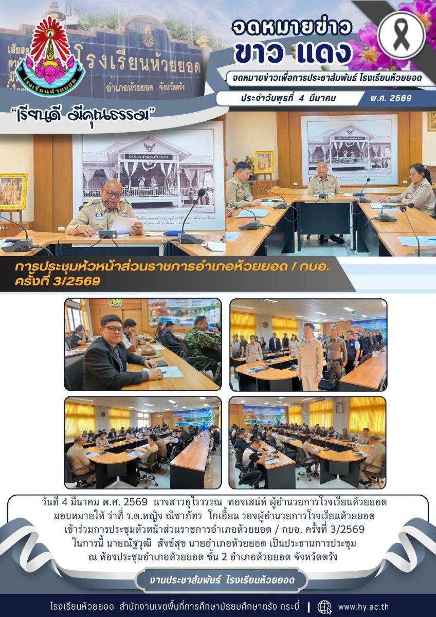 เมื่อวันที่ 4 มีนาคม พ.ศ. 2569 นางสาวอุไรวรรณ ทองเสน่ห์ ผู้อำนวยการโรงเรียนห้วยยอด มอบหมายให้ ว่าที่ ร.ต.หญิง ณิชาภัทร โกเอี้ยน รองผู้อำนวยการโรงเรียนห้วยยอด เข้าร่วมการประชุมหัวหน้าส่วนราชการอำเภอห้วยยอด / กบอ. ครั้งที่ 3/2569 โดยมี นายณัฐวุฒิ สังข์สุข นายอำเภอห้วยยอด เป็นประธานการประชุม ณ ห้องประชุมอำเภอห้วยยอด ชั้น 2 เพื่อร่วมหารือข้อราชการและประสานความร่วมมือระหว่างหน่วยงานในระดับอำเภอ