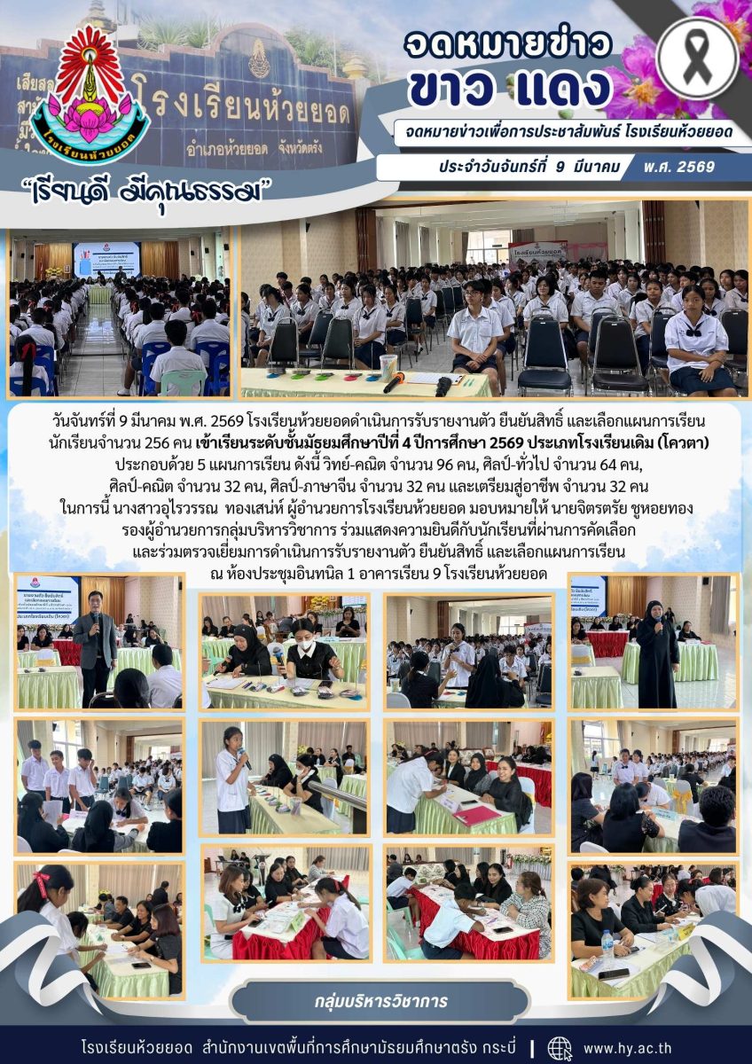 วันจันทร์ที่ 9 มีนาคม พ.ศ. 2569 โรงเรียนห้วยยอดดำเนินการรับรายงานตัว ยืนยันสิทธิ์ และเลือกแผนการเรียนนักเรียนจำนวน 256 คน เข้าเรียนระดับชั้นมัธยมศึกษาปีที่ 4 ปีการศึกษา 2569 ประเภทโรงเรียนเดิม (โควตา) ประกอบด้วย 5 แผนการเรียน ดังนี้ วิทย์-คณิต จำนวน 96 คน, ศิลป์-ทั่วไป จำนวน 64 คน,ศิลป์-คณิต จำนวน 32 คน, ศิลป์-ภาษาจีน จำนวน 32 คน และเตรียมสู่อาชีพ จำนวน 32 คน ในการนี้ นางสาวอุไรวรรณ ทองเสน่ห์ ผู้อำนวยการโรงเรียนห้วยยอด มอบหมายให้ นายจิตรตรัย ชูหอยทอง รองผู้อำนวยการกลุ่มบริหารวิชาการ ร่วมแสดงความยินดีกับนักเรียนที่ผ่านการคัดเลือกและร่วมตรวจเยี่ยมการดำเนินการรับรายงานตัว ยืนยันสิทธิ์ และเลือกแผนการเรียน ณ ห้องประชุมอินทนิล 1 อาคารเรียน 9 โรงเรียนห้วยยอด