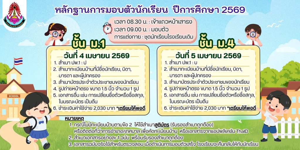 ประกาศรายชื่อนักเรียนรายงานตัวและมอบตัว ชั้น ม.1 ปีการศึกษา 2569 ประเภทห้องเรียนทั่วไป และ ห้องเรียนพิเศษ