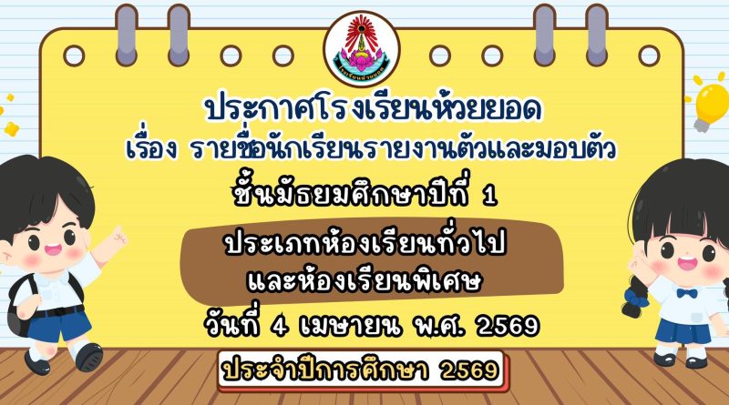 ประกาศโรงเรียนห้วยยอด เรื่อง รายชื่อนักเรียนรายงานตัวและมอบตัว ชั้น ม.1 ปีการศึกษา 2569 ประเภทห้องเรียนทั่วไป และ ห้องเรียนพิเศษ