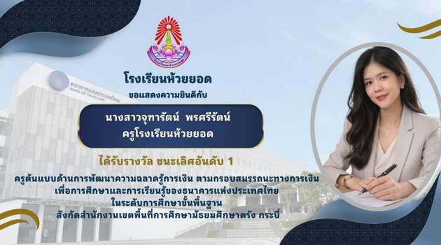 นางสาวจุฑารัตน์ พรศรีรัตน์ ครูโรงเรียนห้วยยอด ได้รับรางวัล ชนะเลิศอันดับ 1 ครูต้นแบบด้านการพัฒนาความฉลาดรู้การเงิน ตามกรอบสมรรถนะทางการเงิน