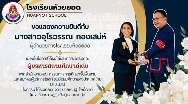 Read Moreนางสาวอุไรวรรณ ทองเสน่ห์ ผู้อำนวยการโรงเรียนห้วยยอด เนื่องในโอกาสได้รับโล่ประกาศเกียรติคุณ ผู้บริหารสถานศึกษาดีเด่น จากสำนักงานคณะกรรมการการศึกษาขั้นพื้นฐาน