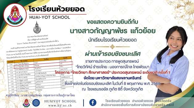 โรงเรียนห้วยยอดขอแสดงความยินดีกับวง H.Y. CHICKABOO BAND ได้รับรางวัลชนะเลิศ